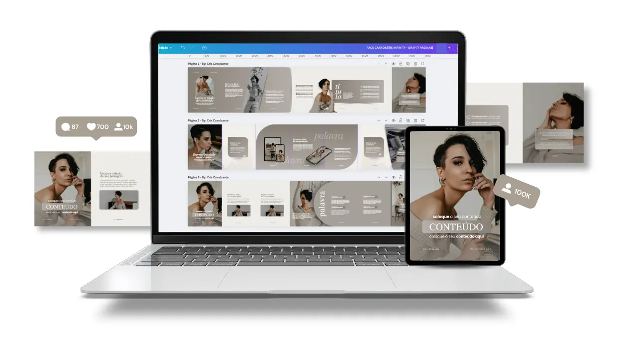 Pack de Templates de Carrosséis Infinitos Prontos e Editáveis no Canva (de 5,6 e 7 páginas) projetados para DESTACAR sua presença no digital e transformar seu perfil em um Feed Profissional, Estratégico e Atrativo.